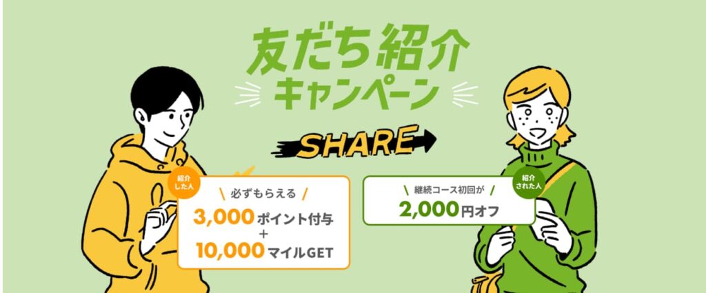 | 紹介されたユーザー (リンク利用者) | 継続コース初回が2,000円OFFになる |
