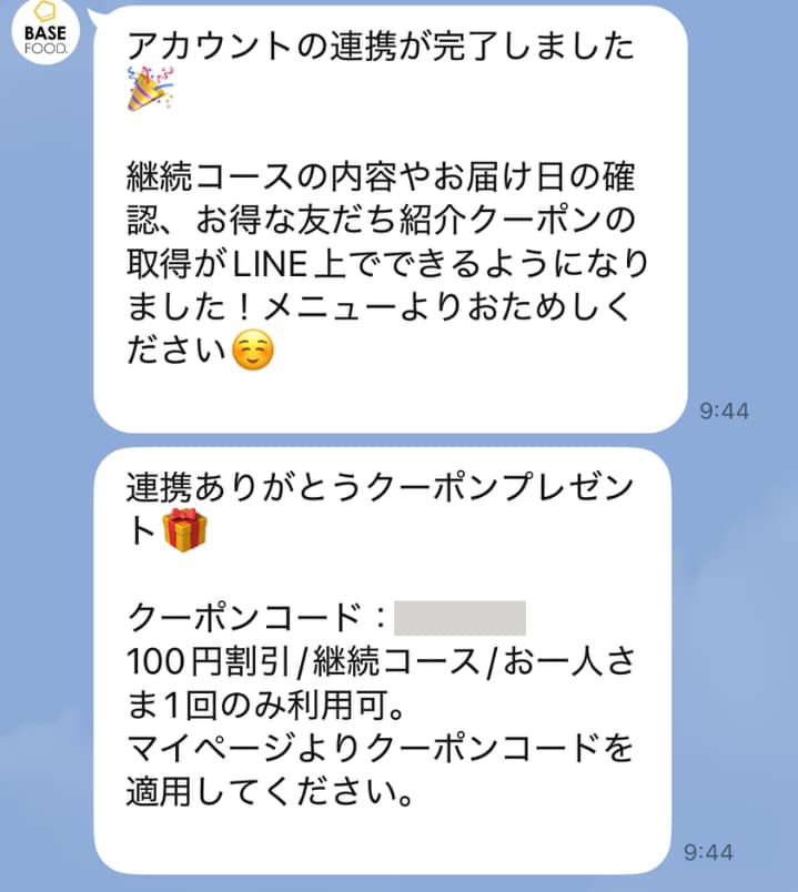 公式サイトのマイページからLINE連携を行い、簡単なアンケートに回答するだけで、100円クーポンがもらえます。