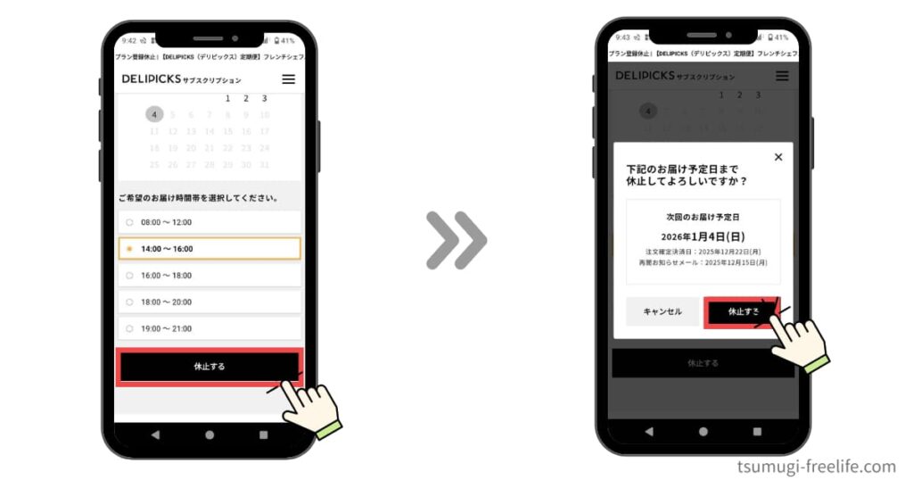 解約やスキップの手続きは、あなたのお届け予定日がある週の、前の日曜日23:59までに済ませる必要があります。