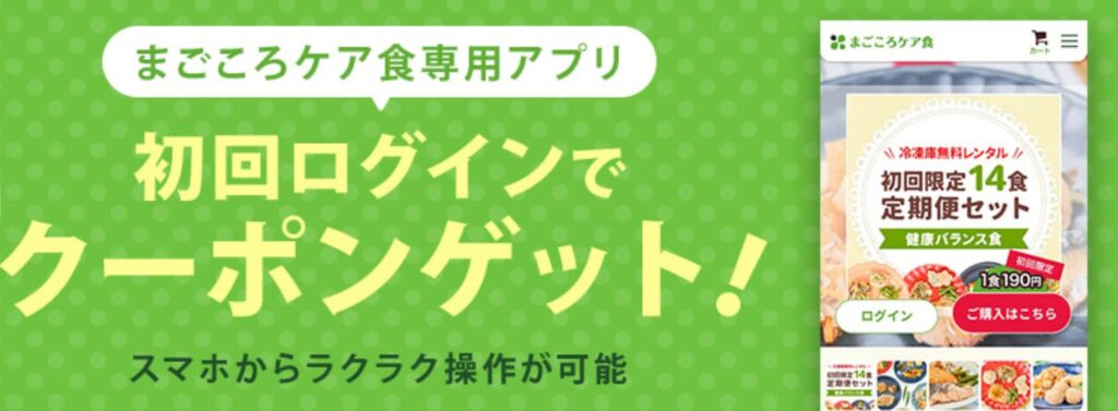 まごころケア食には公式アプリがあり、初回ログインでクーポンがもらえます。