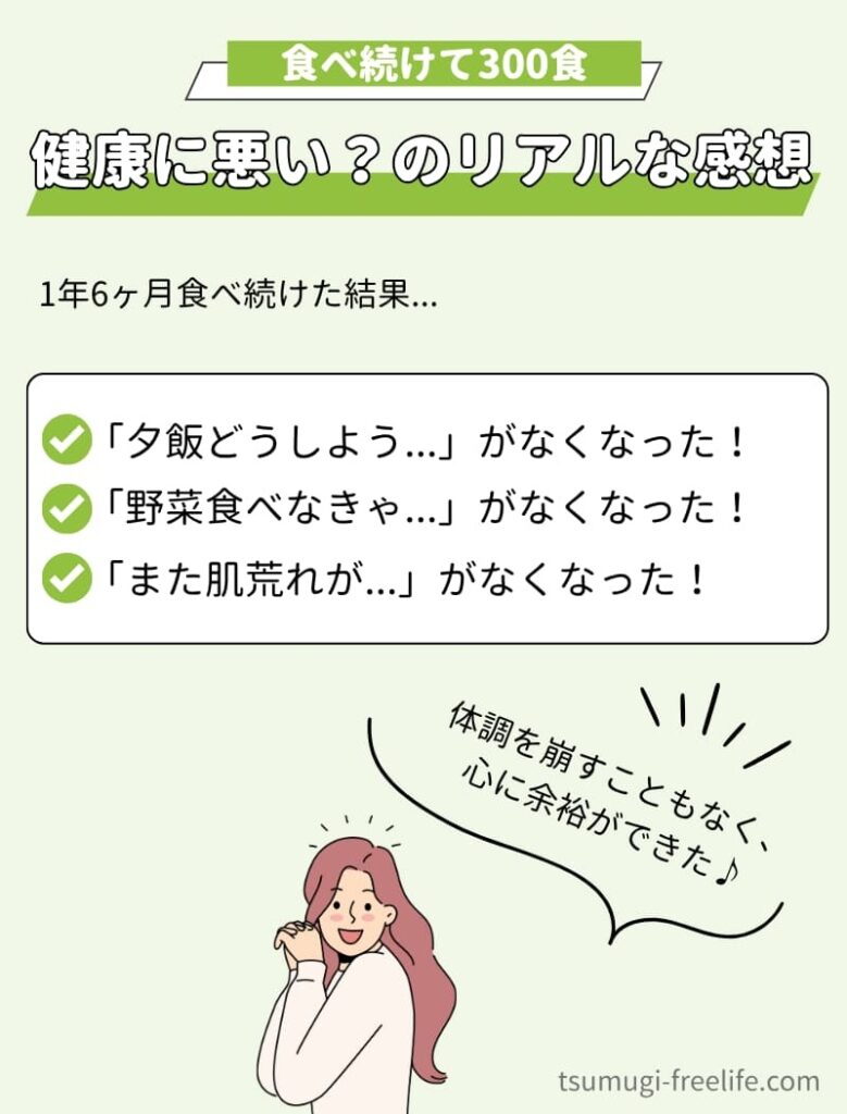なにより、300食以上食べ続けた私自身、健康上の問題は一切なく、むしろ食生活が安定した実感があります。