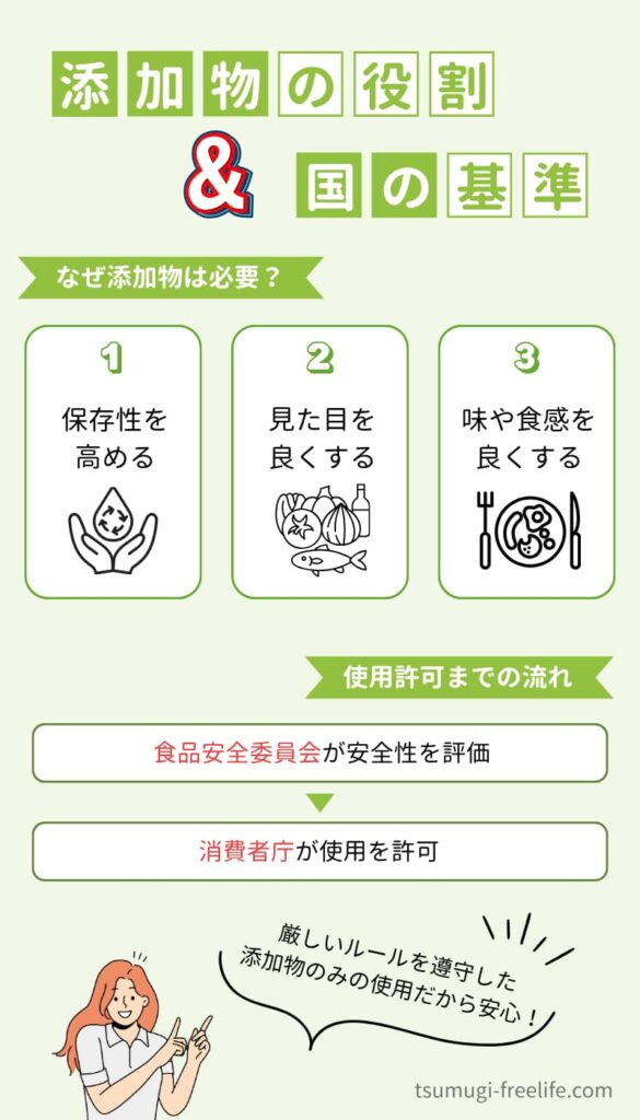 次の章では、そもそもなぜ添加物を使用する必要があるのか、役割や国の安全基準について解説します。
