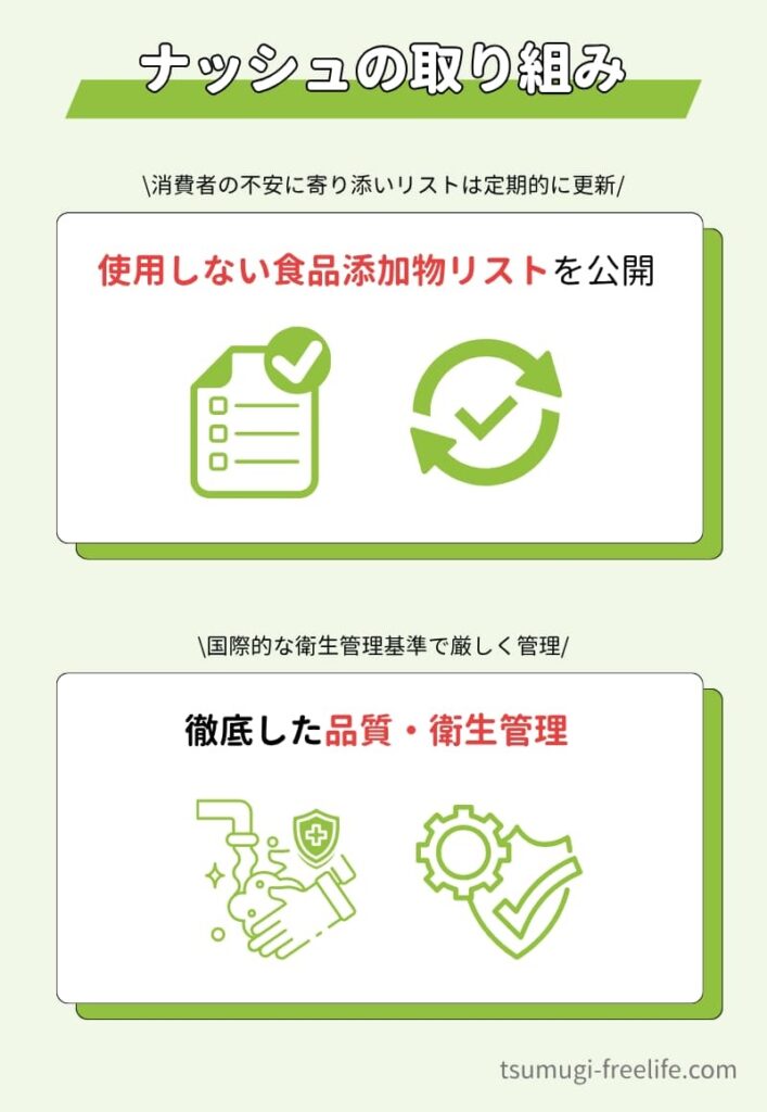 ナッシュは、使用しない添加物リストを公式サイトで公開し、食の安全に対する誠実な姿勢を示してくれていますよ。