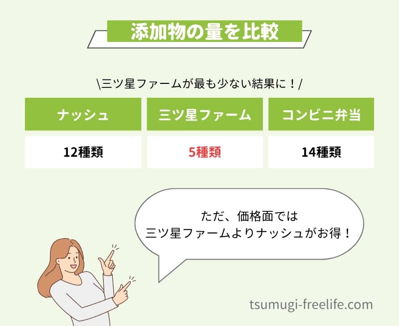 そこで、ナッシュと同様に人気の宅配食サービスである三ツ星ファームと、コンビニ弁当の添加物を比較してみました。
