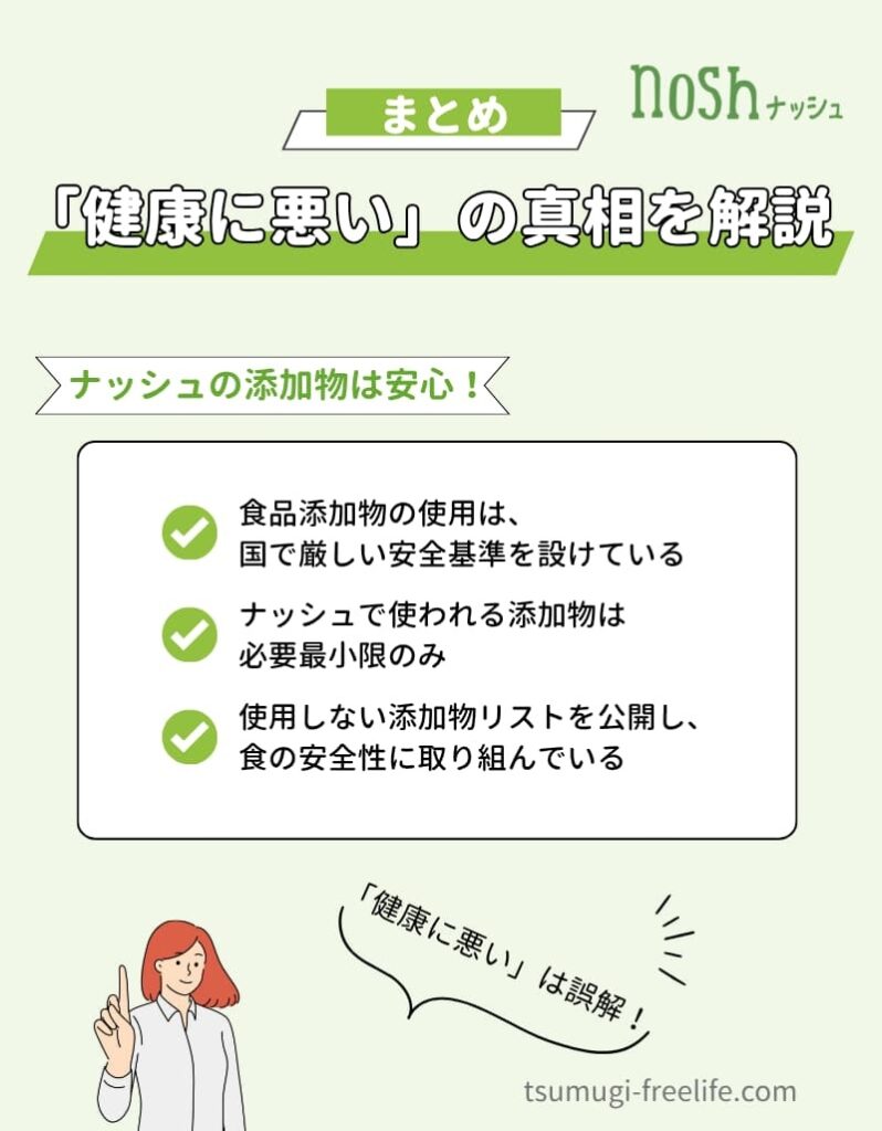 だからこそ、ナッシュが無添加ではないと知って、漠然とした不安を感じるのも無理はありません。