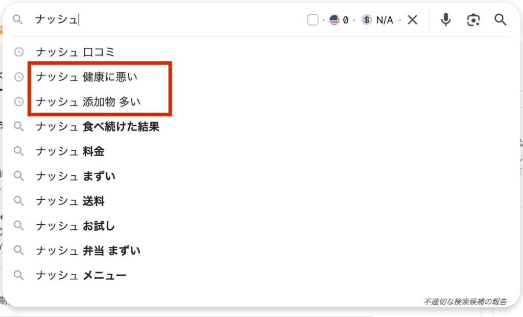 実際に、Googleの検索候補にも「健康に悪い」や「添加物多い」が表示されています。