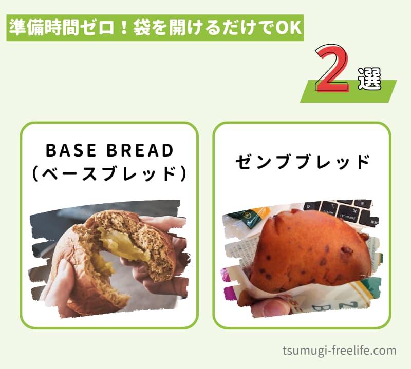 まず次の章では、袋を開けるだけで食べられる、利便性の高いパンタイプの食事を2つ紹介しますね。