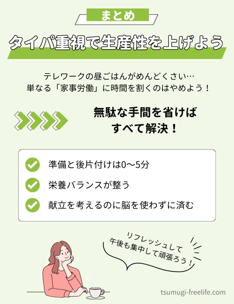 まとめ|テレワーク中の昼ごはんはめんどくさい手間を無くして生産性を上げよう