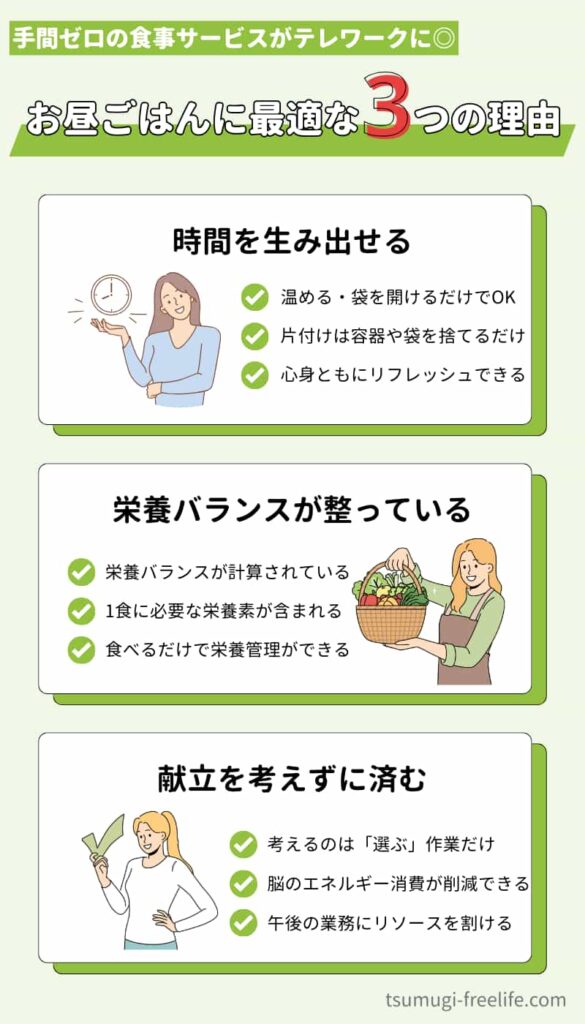 テレワーク中の昼ごはんを家事で消費させず、自分のために使う時間を増やせますよ。