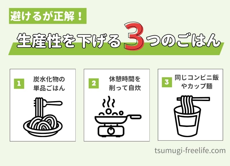続いては、午後の仕事のパフォーマンスを下げるNG昼ごはんを解説します。