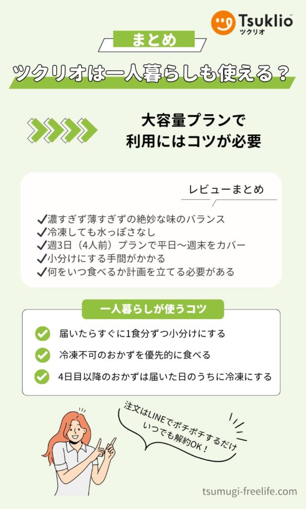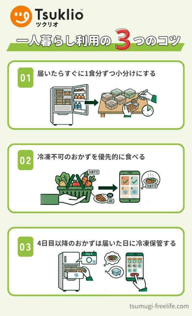 ツクリオは2人前または4人前のボリュームで届くため、一人暮らしで毎日のおかずとして使いこなすには、コツが必要です。