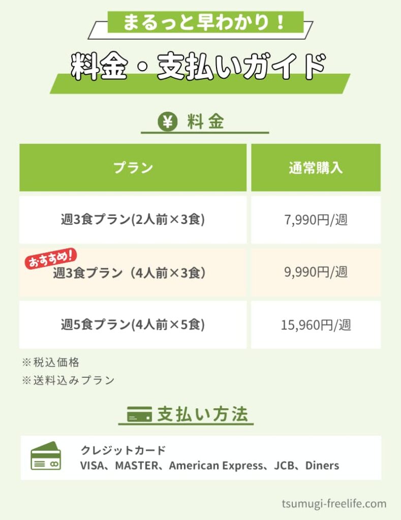 | プラン | 週3食プラン (2人前×3食) | 週3食プラン (4人前×3食) | 週5食プラン (4人前×5食) |