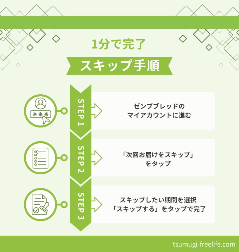この記事では、ゼンブブレッドの解約・停止・スキップの手順を、画像付きでわかりやすく解説しました。