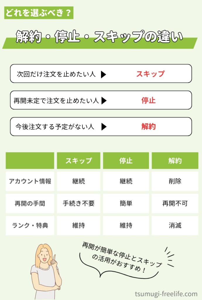 - 解約・停止・スキップの違いは?あなたに合う選び方