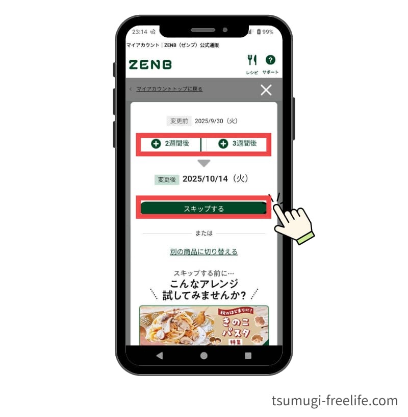また、スキップではなく「お届け日変更」を使って、配送日をずらすことも可能です。