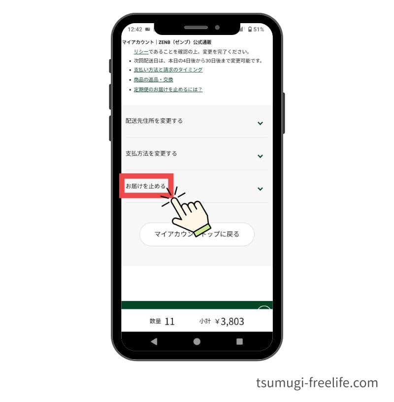 マイアカウントで完結する停止を行えば、その時点で次回配送はストップします。