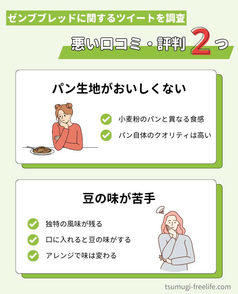ゼンブブレッドは豆粉を使用したパンのため、独特の豆の味が苦手に感じる人もいます。